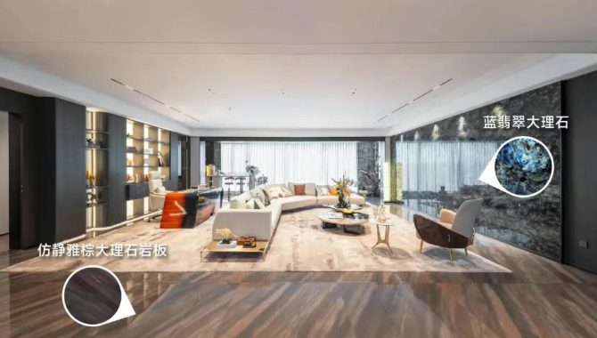 以君一·太原海尚府430㎡天幕平墅为例,光空间尺度就印证了格局之美。LDKB一体化设计,阔绰通透;3.45米层高、约9米横厅、约12.5米双阳台,空间恢宏大气。在材质上,玄关和客厅背景墙选用来自马达加斯加的“蓝翡翠”天然石材,浩瀚璀璨,透着神秘感;全屋是博洛尼高端定制,玄关柜门用天然橡木皮,衣帽间是意大利设计师款,肌理细腻,贵族气质十足却不浮夸。