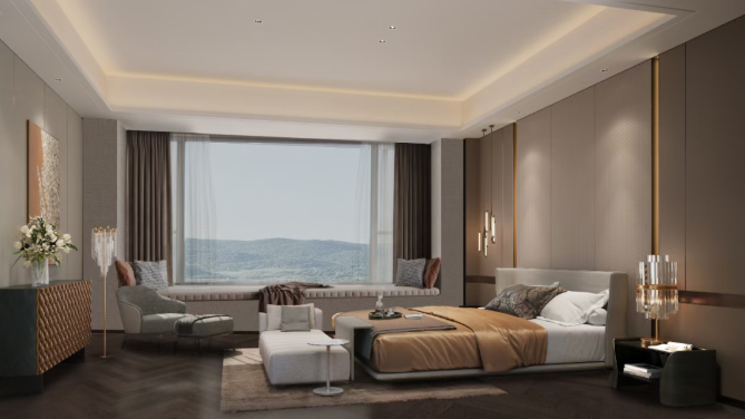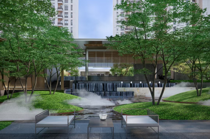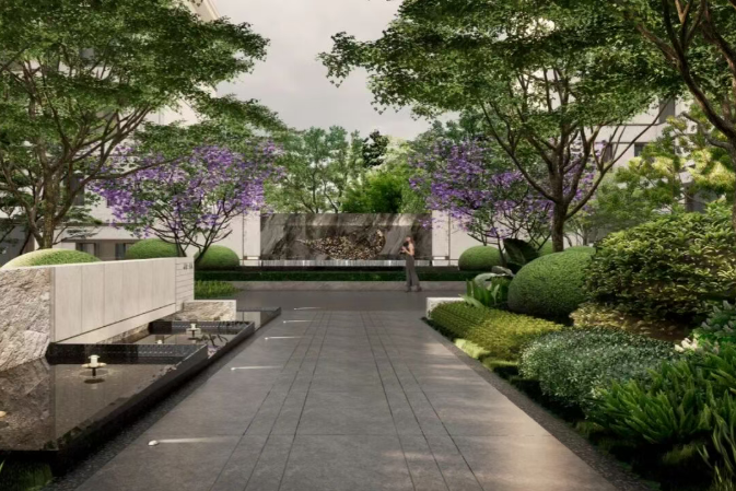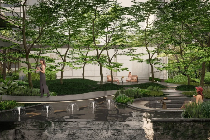 这一点,在君一·伴山鸣樾尤为凸显。该项目以 1.2 超低容积率为基础,取法东方哲学并融入国际视野,营造 “一轴两带六园” 静谧之境,规划山谷剧场、五感花园,搭配珍奢石材与名贵树种,与外部7500亩原生山林呼应,实现“外享山海桃源、内揽自然园林”的居住体验。