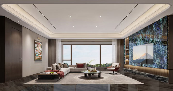 在君一·伴山鸣樾,墅居洋房将现代极简与奢华质感完美融合。雪山银奢石背景墙如艺术品般独特,毫米级的木饰面处理展现非凡品味,为山海之间的生活增添无限意境。