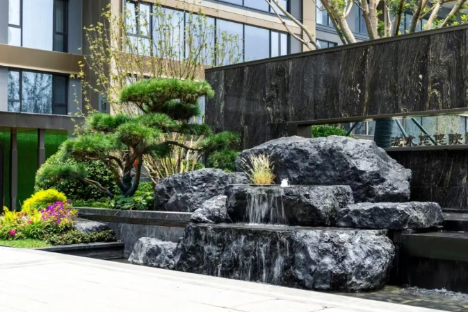 君一·太原海尚府将自然与风雅融于园林,用巴西 “宇宙金”大理石打造水景墙,金色脉络透着神秘奢华,主题水景区融入元宝潭、鱼跃潭、如意桥、泰山景石等,摹绘泰山云海营造“上风上水”意境,同时引入湖北荆门百年对节白蜡古木与山东泰山苍劲黑松,全冠移植打造浓郁自然韵味。